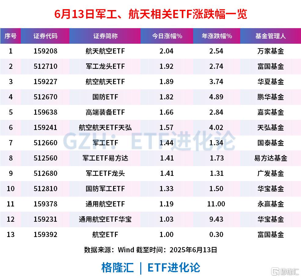 ETF方面,多只航天相关ETF上涨,万家基金航天航空ETF、富国基金军工龙头ETF、华夏基金航空航天ETF分别涨2.04%、1.92%、1.89%,鹏华基金国防ETF、嘉实基金高端装备ETF、航空航天ETF天弘分别涨1.82%、1.66%和1.57%。