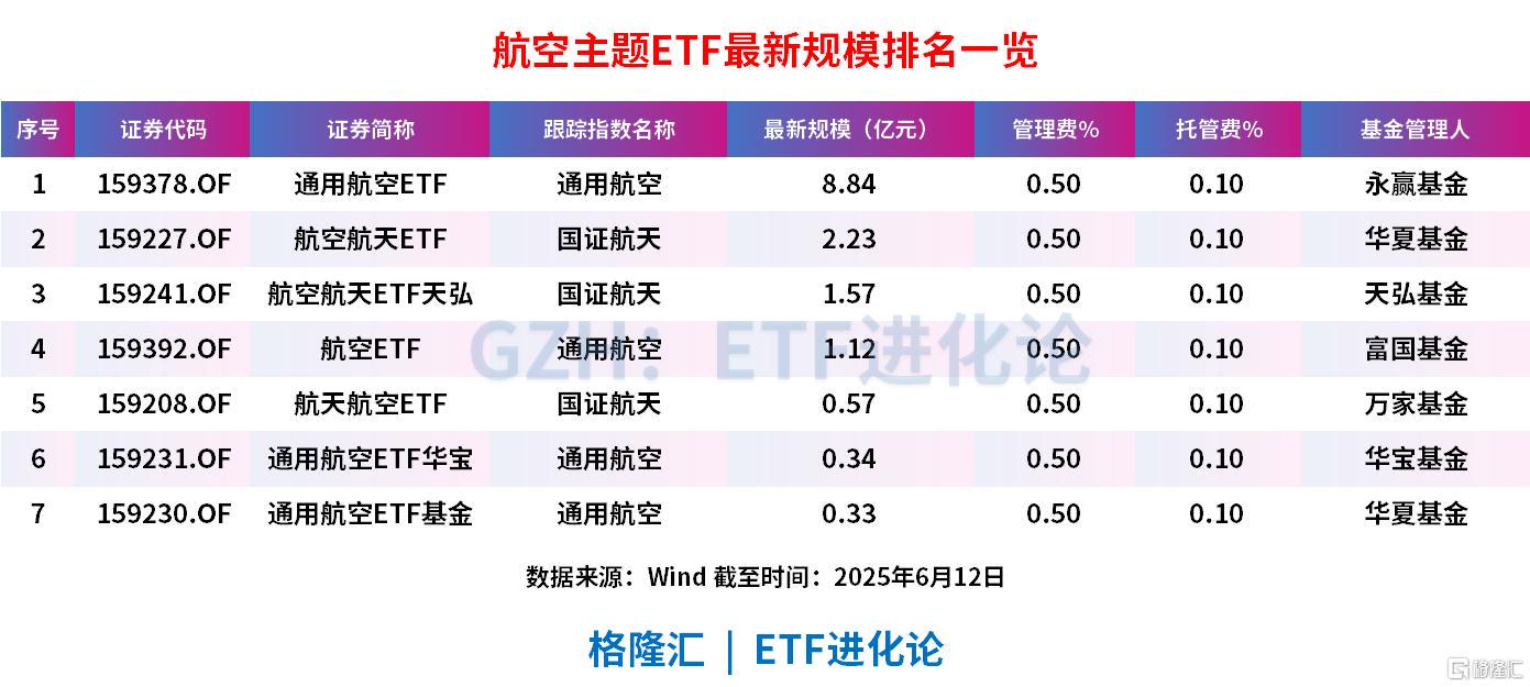 从具体的ETF产品来看,跟踪通用航空指数的ETF中,规模最大的是永赢基金通用航空ETF,最新规模为8.84亿元。跟踪国证航天指数中,规模最大的是华夏基金航空航天ETF,最新规模是2.23亿元。