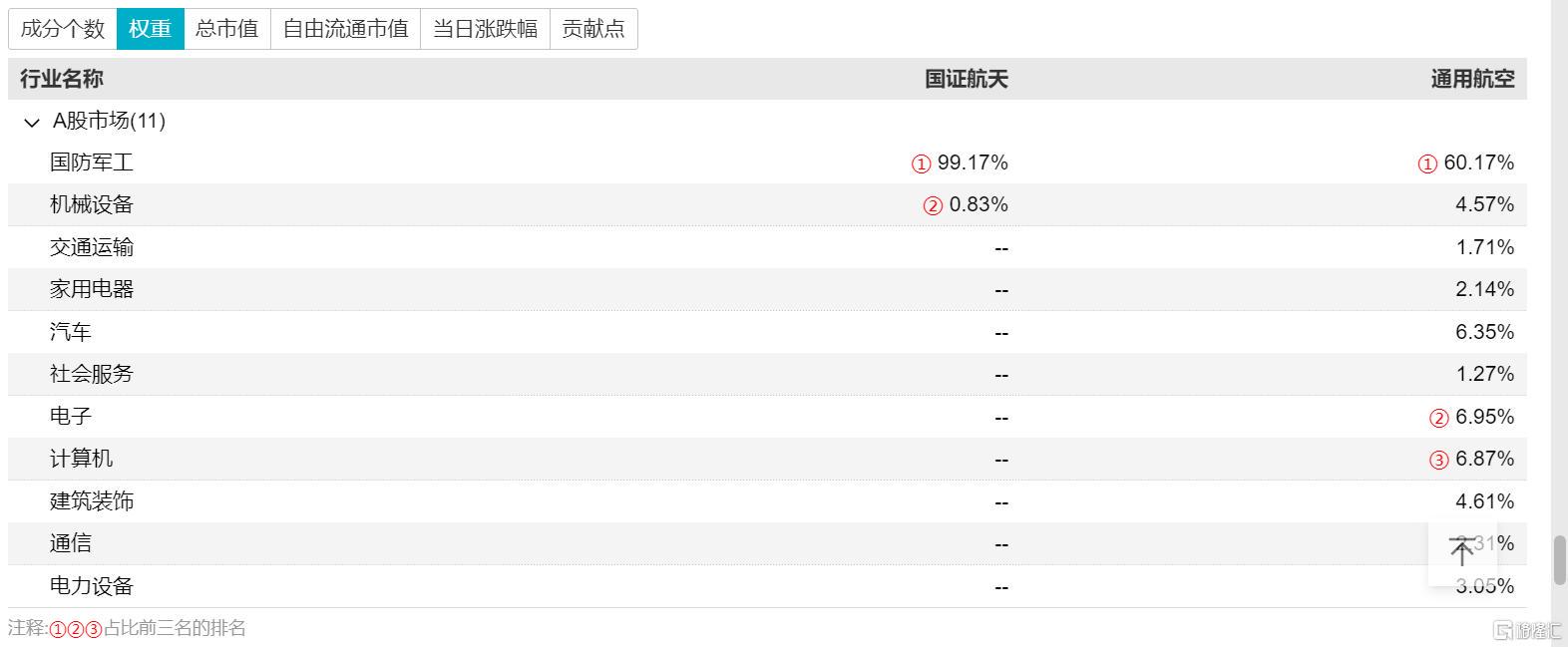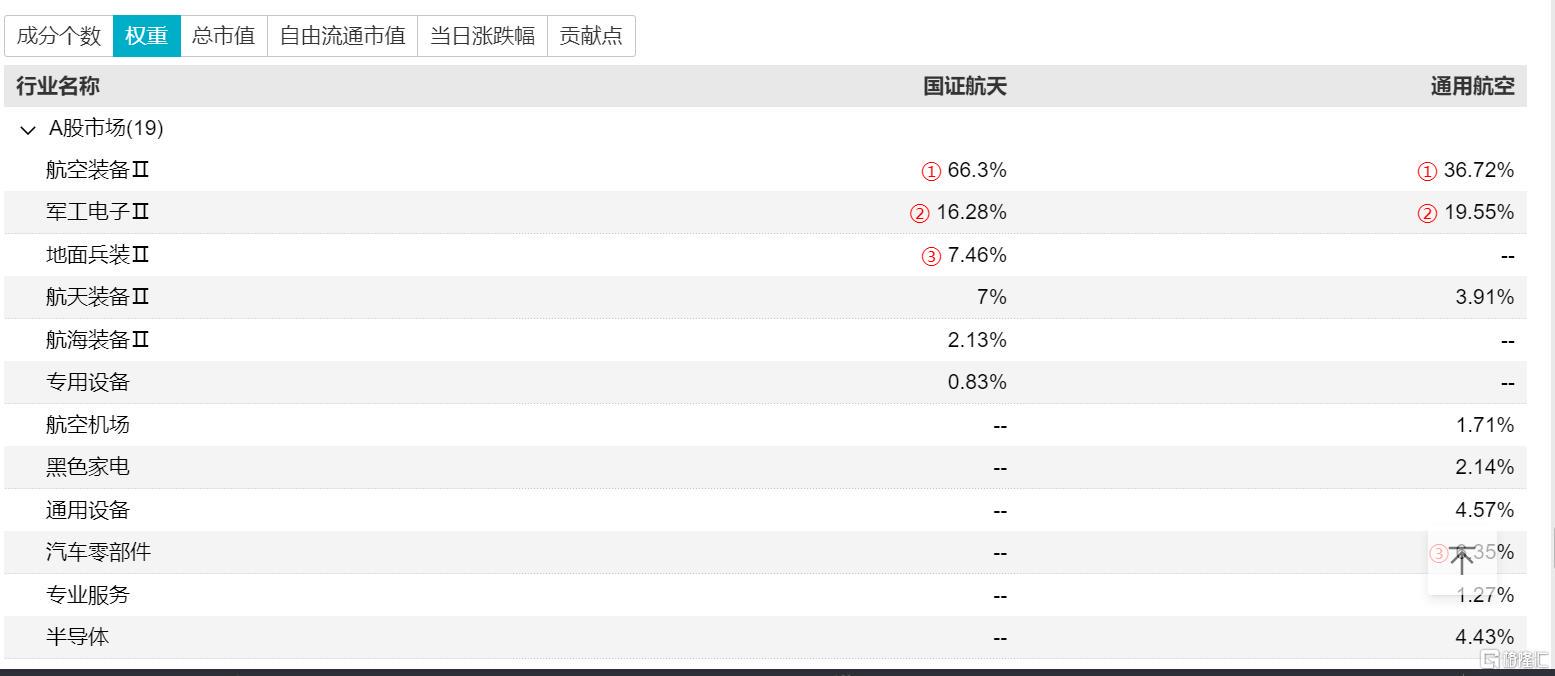 从申万一级行业的分布来看,国证航天指数99.17%是国防军工行业,而通用航空指数是60.17%国防军工行业+6.95%计算机+6.87%计算机。